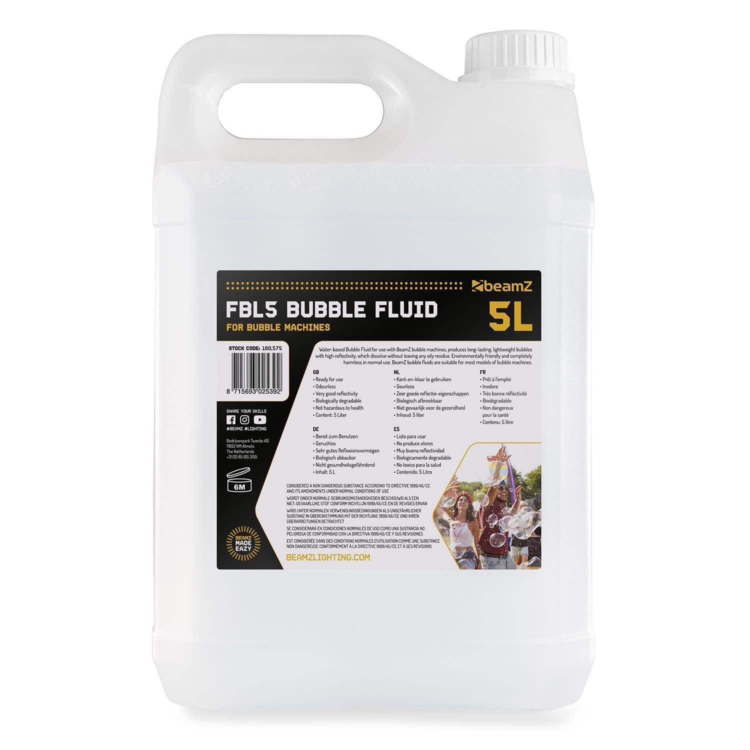 Liquido de burbujas con base de agua para usar en las máquinas de burbujas de BeamZ, para uso prolongado, conseguir burbujas ligeras, buena reflectividad, y disolución sin dejar rastro aceitoso. Respetuoso con el medio ambiente y completamente inocuo en su uso normal. Los líquidos de burbujas BeamZ se pueden usar en cualquier máquina de burbujas estándar.